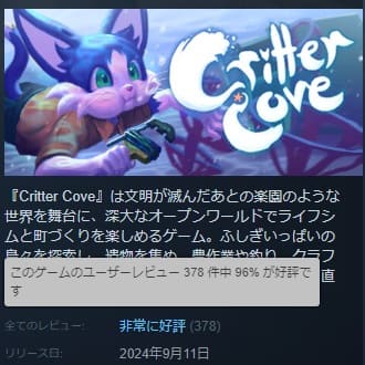 このゲームの開発スタッフがとても仲の良いお友達のゲームで、日本の田舎で農業が出来る農業&ライフシムです。クリッターコーブはSunnySideのプロジェクトを強く応援していて、発売月である2024年の6月には、Discordにて2024年6月8日のAnnouncementで、向こうのヒロインである高橋キャサリンのアイコンを使ったり、リツイートしたりで応援しました。
